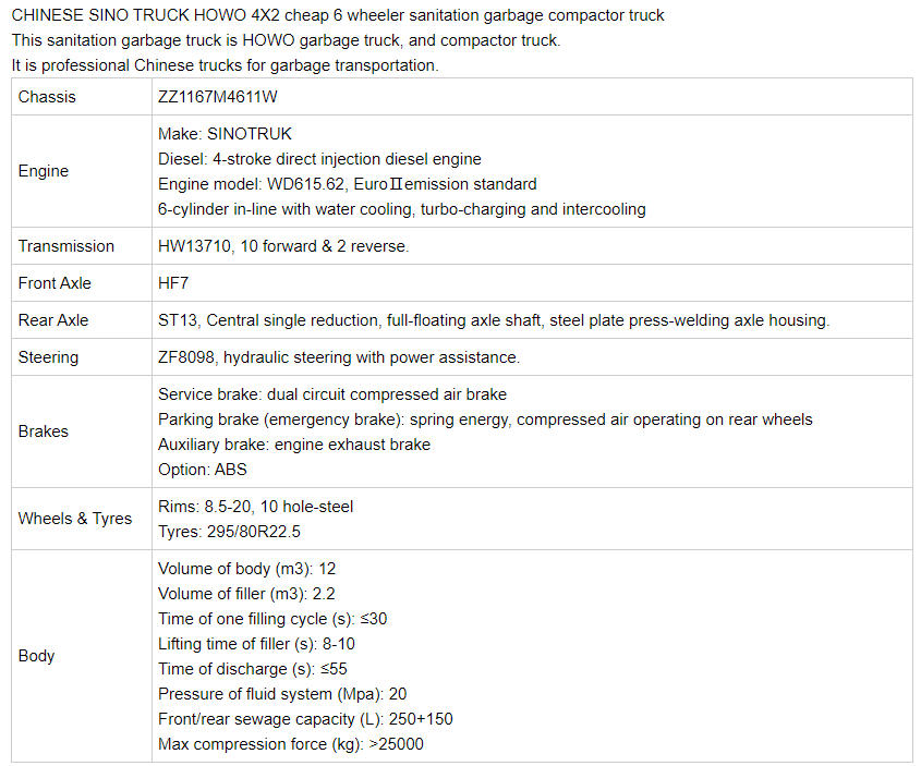 Chinese SINO TRUCK HOWO 4X2 Cheap 6 Wheeler Sanitation Garba